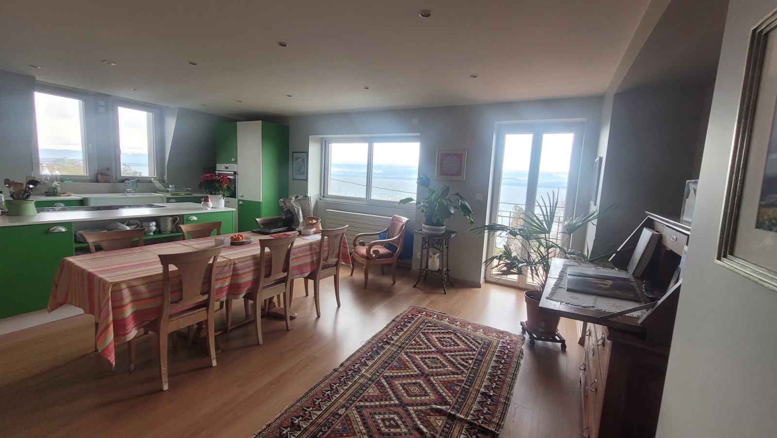 Depuis la maison, et certaines chambres, la vue panoramique s'étend sur toute l'immensité du lac et les montagnes suisses. Les photos parlent d'elles-mêmes : un horizon unique, une lumière changeante, une atmosphère apaisante tout au long de l'année.