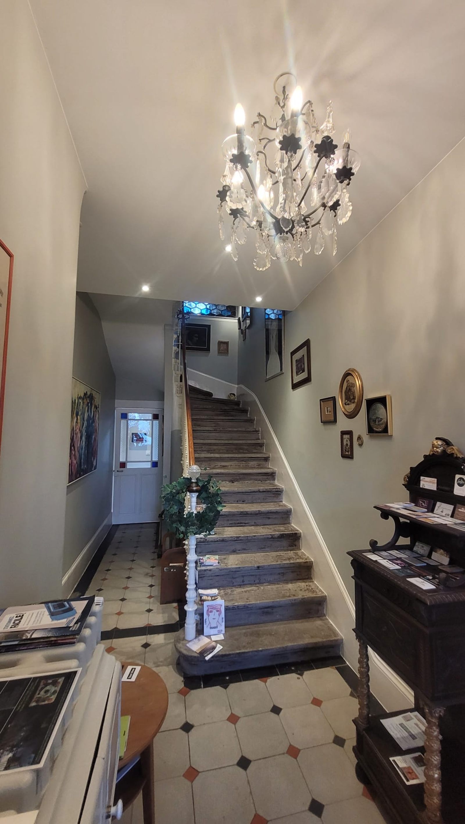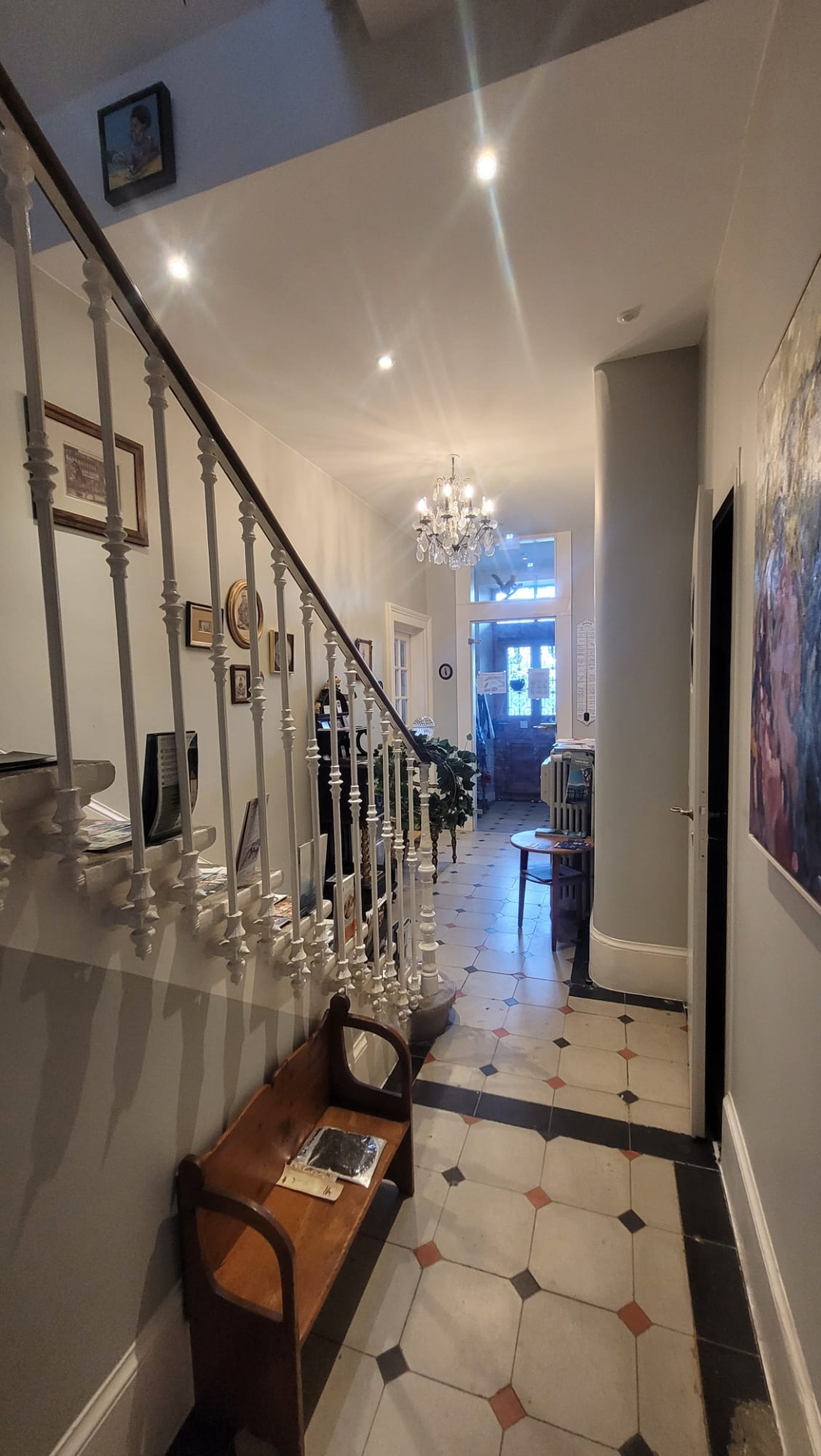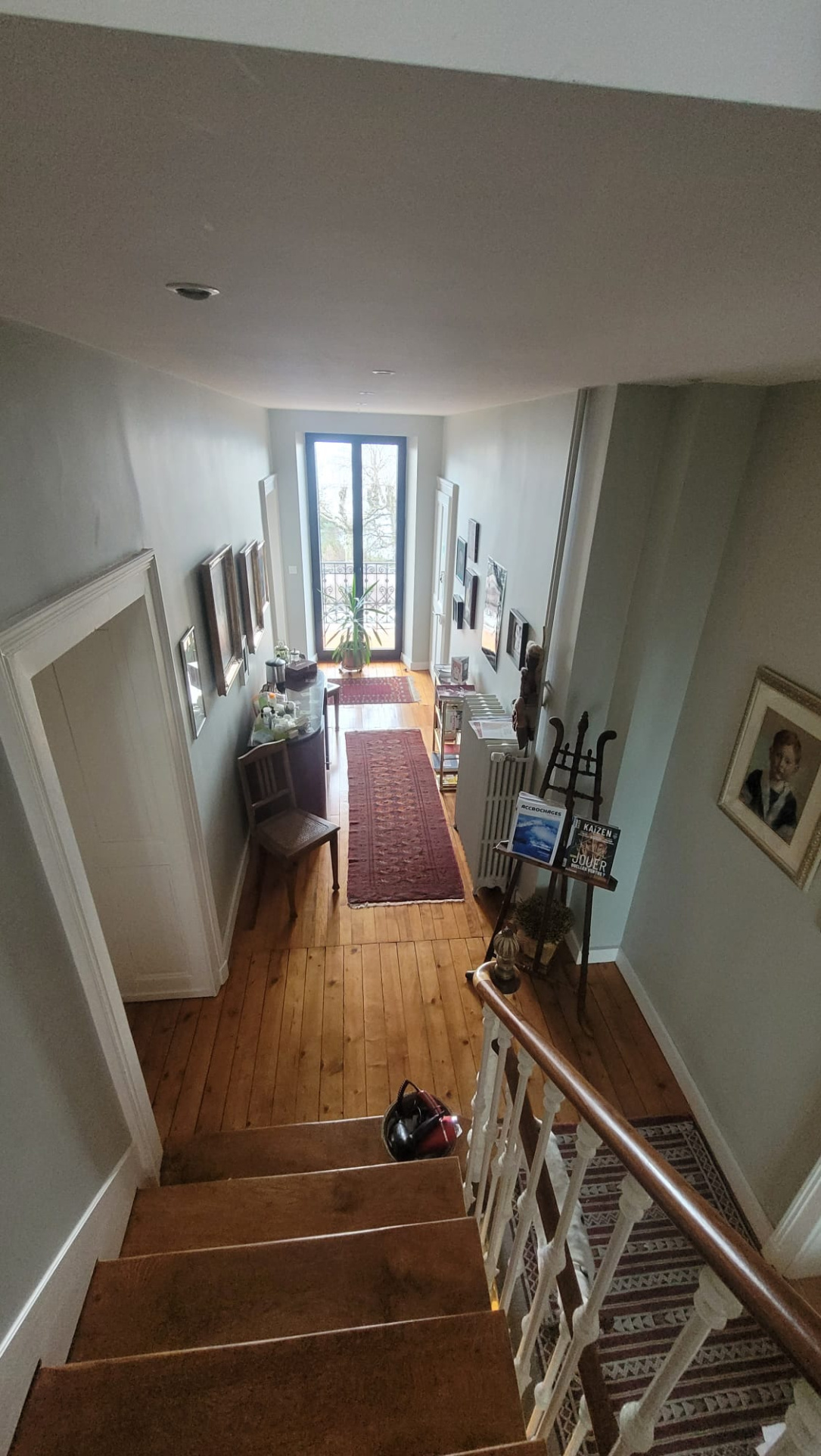 À l'intérieur, l'entrée présente de magnifiques carreaux anciens, un escalier travaillé et un lustre d'époque, parquet authentique témoignant du charme préservé et du caractère bourgeois du lieu.